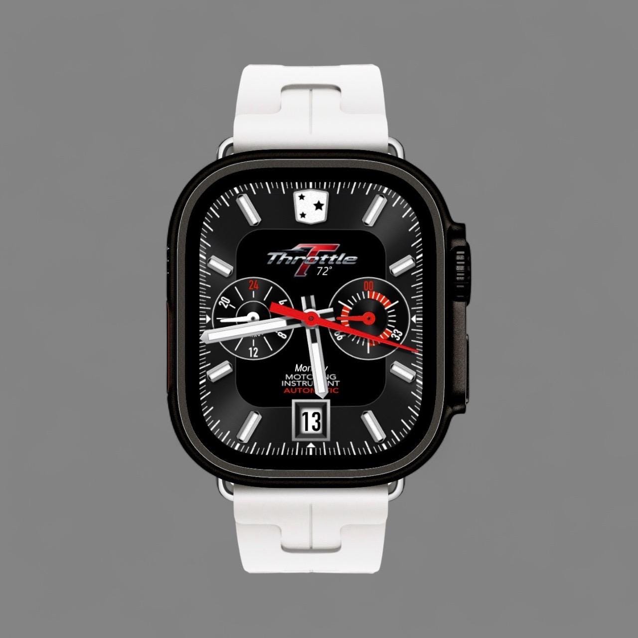 Feel the power of the track on your wrist. The Throttle Racing Automatic from Tonytime70 combines the look of high-performance motorsport gauges with the precision of modern smartwatch design. Inspired by analog chronographs and racing dashboards, this exclusive Clockology face brings an automatic racing instrument aesthetic to your Apple Watch.