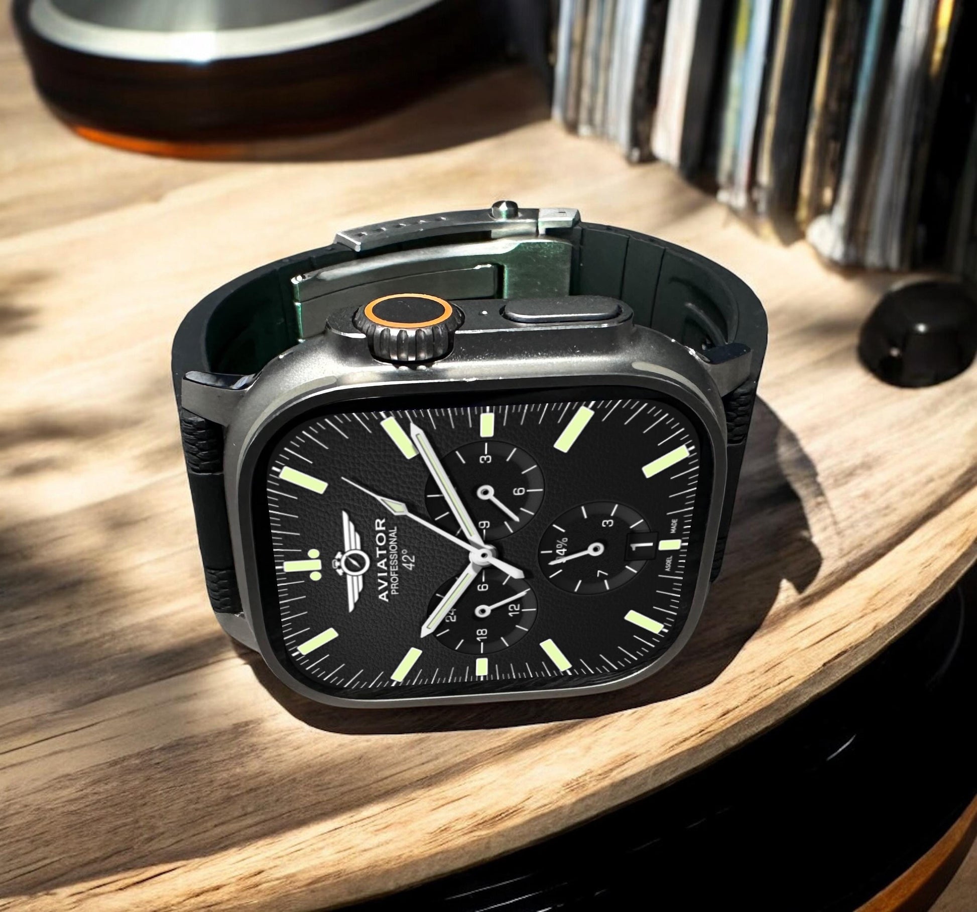 This is the AviatorCo. Professional X Watch face; featuring 24 hr time, a 2nd time zone, battery 🔋, date and time of day.